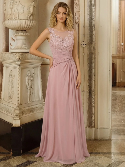 A Line Lace Applique Pleated Long Mother of the Bride Dresses